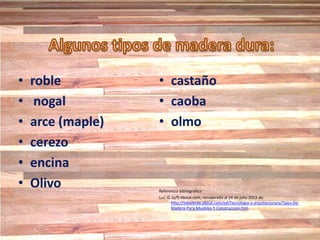 - Merbau: De color marrón rojizo, resistente y duradera, usada en pisos y mobiliario.